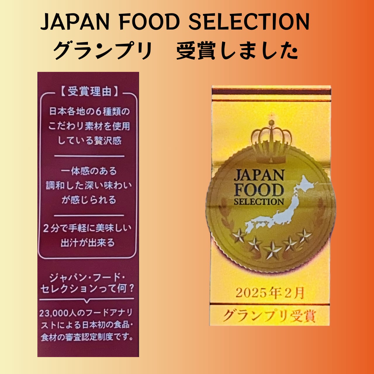 あご(飛び魚)を主原料に6種類の風味原料を使用し、独自製法でコクのあるうまみを引き出しました。ご家庭で簡単に本格だしが楽しめます